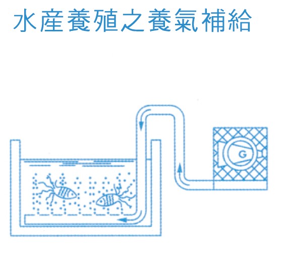 如圖所示,氧氣補給的過程需要將輸氣管連接高壓風機的吹氣口,輸氣管的另一頭連接著水池底部,在水池部分需鉆有數個小孔,檢查水池以外的輸氣管是否會泄露空氣,保證風機吹出的氣體能順利的到達水池底部,這樣高壓風機就可以從外界吸取空氣來給水產補給氧氣了。